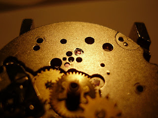 Nesta altura e após ter dado tensão à mola de força, o mecanismo começou a trabalhar… É altura de virar o mecanismo e começar a trabalhar no topo deste (colocação dos vários componentes… pignon collant, pignon remontoir, as várias engrenagens para ponteiros, calendário e afins.). Chegado aqui… deparei-me com duas molas totalmente danificadas devido ao oxido de ferro (ver indicação na foto), pelo que foi necessário fabricá-las… Isto porque não consegui encontar no mercado material de substituição.