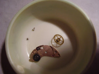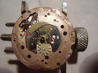 Esta peça estava com o mecanismo “preso” pela oxidação (ferrugem e verdete) e consequentemente não trabalhava . Ainda pensei em parar com a tentativa de “reanimação” desta peça, não de restauro, pois saíria muito caro (Dials e caixa em mau estado, aliás como todo o conjunto). Mas o gosto por “fazer reviver” um mecanismo há muito “adormecido”, foi mais forte e pouco depois comecei o trabalho… A máquina foi toda desmontada e colocada em ácido próprio para remoção do oxido de ferro e de cobre. De seguida seguiu-se o tradicional banho (lavagem), usado na relojoaria.