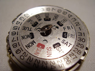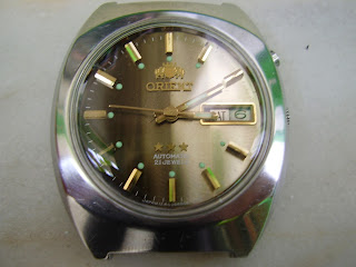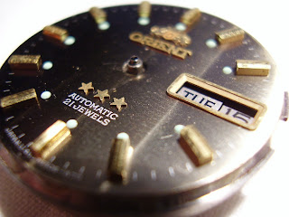 Um dos primeiros calibres da Oriente de 1970 (digo isto, porque a roda de calendário ainda é metálica, coisa que a partir de 1990 começou a ser colocado em plástico).