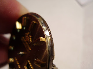 Se repararem o dial já tem uns arranhões, fruto de mau manuseamento anterior. Aliás, como poderão visualizar, o mostrador foi colado, devido aos pinos de fixação deste, estarem partidos.